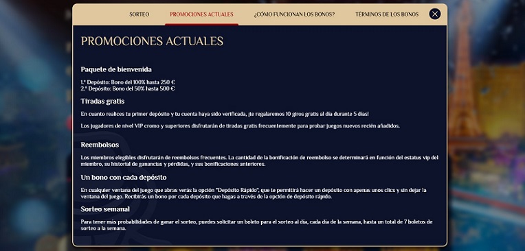 Para nuevos jugadores está disponible el paquete de bienvenida en la que por tu primer depósito te igualarán la cantidad que deposites en dinero de bono hasta un máximo de 250 euros y cuando hagas tu segundo depósito, te darán la mitad del dinero que hayas depositado hasta un máximo de 500€. Podrás consultar el dinero de bono en la sección Mi Cuenta. Para completarlo necesitarás hacer un depósito mínimo de 10€ y apostar el dinero del bono 120 veces antes de proceder a su retirada.
